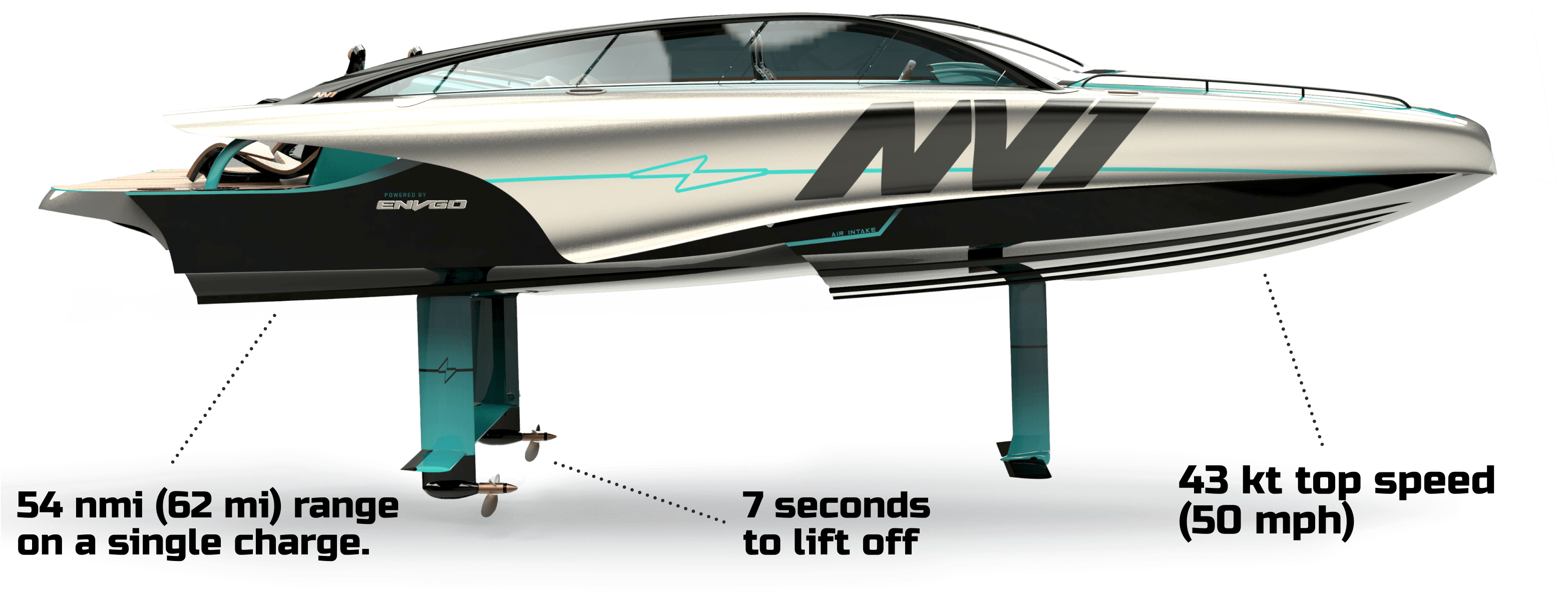 At 19 kts, NV1's hydrofoils autonomously deploy. The hull lifts above. Drag disappears. What replaces it is something closer to flight than anything the marine world has produced before.